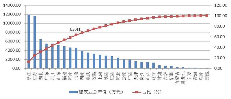 除浙江、江蘇兩省外,總產值超過4000億元的還有湖北、廣東、四川、山東、福建、河南和北京共7個地區,上述9省市完成的建筑業總產值占全國建筑業總產值的63.41%。