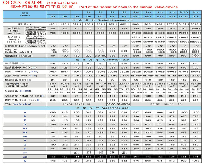 QDX3-G系列 部分回轉(zhuǎn)型閥門手動裝置該產(chǎn)品是一種90°回轉(zhuǎn)驅(qū)動裝置,適用于球閥、蝶閥、旋塞閥等類型閥門。特殊型可輸出360°轉(zhuǎn)角。而且手輪方向朝上適用于管道閥門。